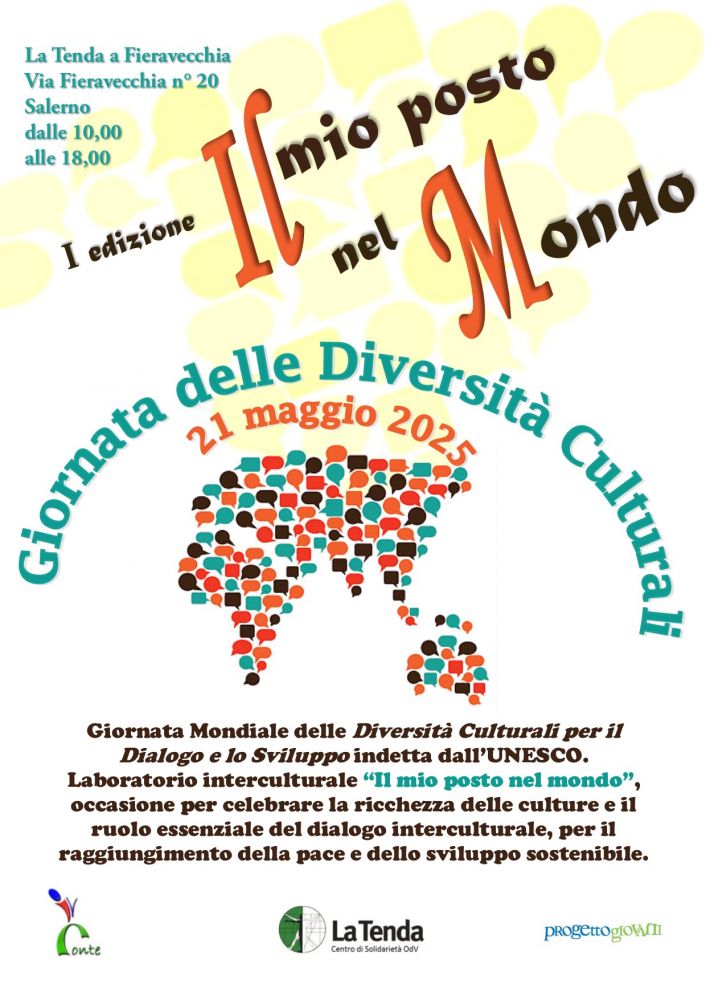 Il giorno 21 di maggio 2025, in occasione della Giornata Mondiale della Diversità Culturale per il Dialogo e lo Sviluppo indetta dall’UNESCO, presso la sede de La Tenda a Fieravecchia a Salerno, sarà inaugurata la prima edizione del laboratorio interculturale “Il mio posto nel mondo”, un’occasione per celebrare la ricchezza delle culture e il ruolo essenziale del dialogo interculturale, per il raggiungimento della pace e dello sviluppo sostenibile.