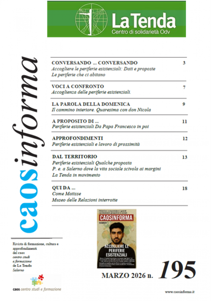 Il numero 195 di CaosInforma dedica loro uno sguardo diretto, osservando come i territori provano a rispondere ai bisogni di chi vive ai margini. L’accoglienza viene letta come un processo relazionale e continuativo, capace di costruire percorsi di ascolto, tutela e autonomia. I dati e le esperienze raccolte mostrano una rete attiva ma sotto pressione, che richiede coordinamento, strumenti condivisi e una visione più sistemica. Le periferie esistenziali diventano così un indicatore della capacità di una comunità di prendersi cura delle sue parti più fragili.