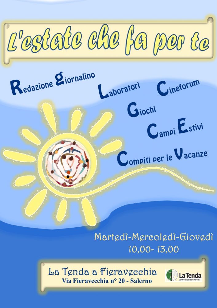Partono le attività estive per le ragazze e i ragazzi del territorio salernitano presso La Tenda a Fieravecchia (Via Fieravecchia n 20 Salerno) e il Centro per l’Infanzia La Tenda a Mercato San Severino Loc. Piazza del Galdo.