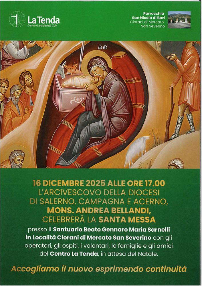 Con queste intenzioni ci accingiamo a vivere il Natale e come da tradizione celebreremo la Santa Messa con l'Arcivescovo di Salerno, Mons. Andrea Bellandi il 16 dicembre alle ore 17.00 presso il Santuario Beato Gennaro Maria Sarnelli di Ciorani di Mercato San Severino, dove ci ritroveremo con operatori, ospiti, famiglie ed amici del nostro Centro.