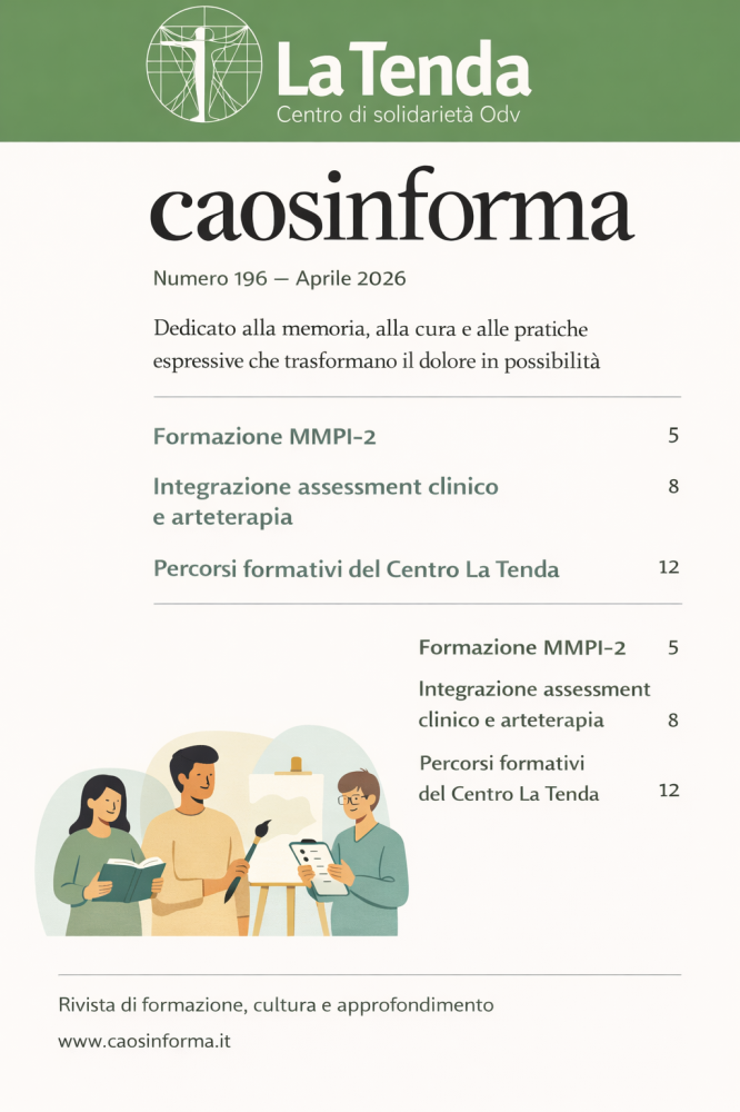 Dedicato alla memoria, alla cura e alle pratiche espressive che trasformano il dolore in possibilità, il numeo 196 di caosinforma introduce i laboratori e percorsi formativi del Centro La Tenda, con un focus sulla formazione all’uso dell’MMPI‑2 e sull’integrazione tra assessment clinico e arteterapia.