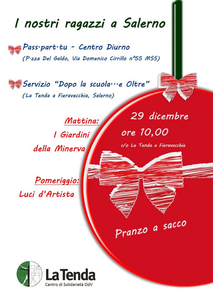 Il 29 dicembre prossimo a Salerno si terrà una giornata di aggregazione per i due Centri di animazione territoriale de La Tenda, siti in Salerno (il Servizio di Dopo la scuola… ed oltre) e in località Piazza del Galdo di Mercato San Severino (Pass.par.tu): i ragazzi si uniranno per vivere insieme una giornata all'insegna della bellezza, della condivisione e della solidarietà.